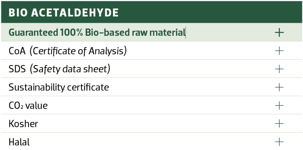 We are proud to be able to offer our finest bio-based Acetaldehyde which, when it replaces fossil alternatives, has a reduced climate impact of up to 50 per cent. If you choose our Acetaldehyde you get a fully certified product with a 100% bio-based raw material.
