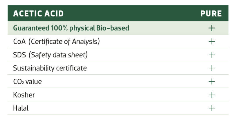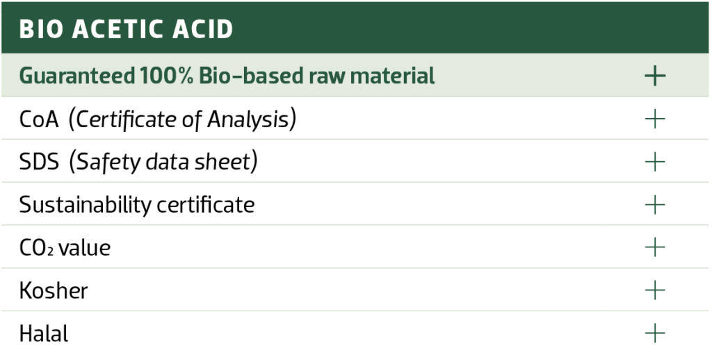 We are proud to be able to offer our finest sustainability labelled Bio Acetic Acid which gives you a fully certified product guaranteed to have 100% bio-based raw material. When switching from fossil-based acetic acid to bio-based acetic acid, CO2 emissions can be reduced by 50 percent.