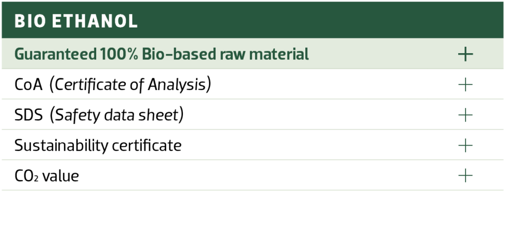 We are proud to be able to offer our finest sustainability labelled Bio Ethanol which gives you a fully certified product guaranteed to have 100% bio-based raw material.